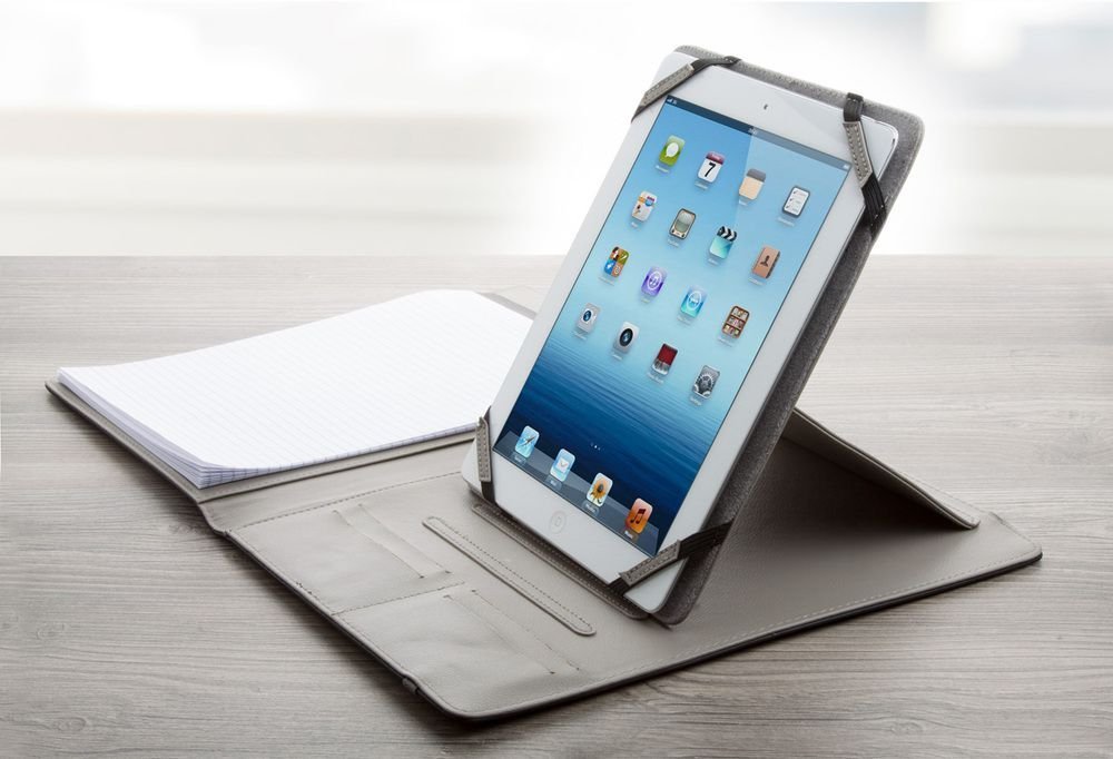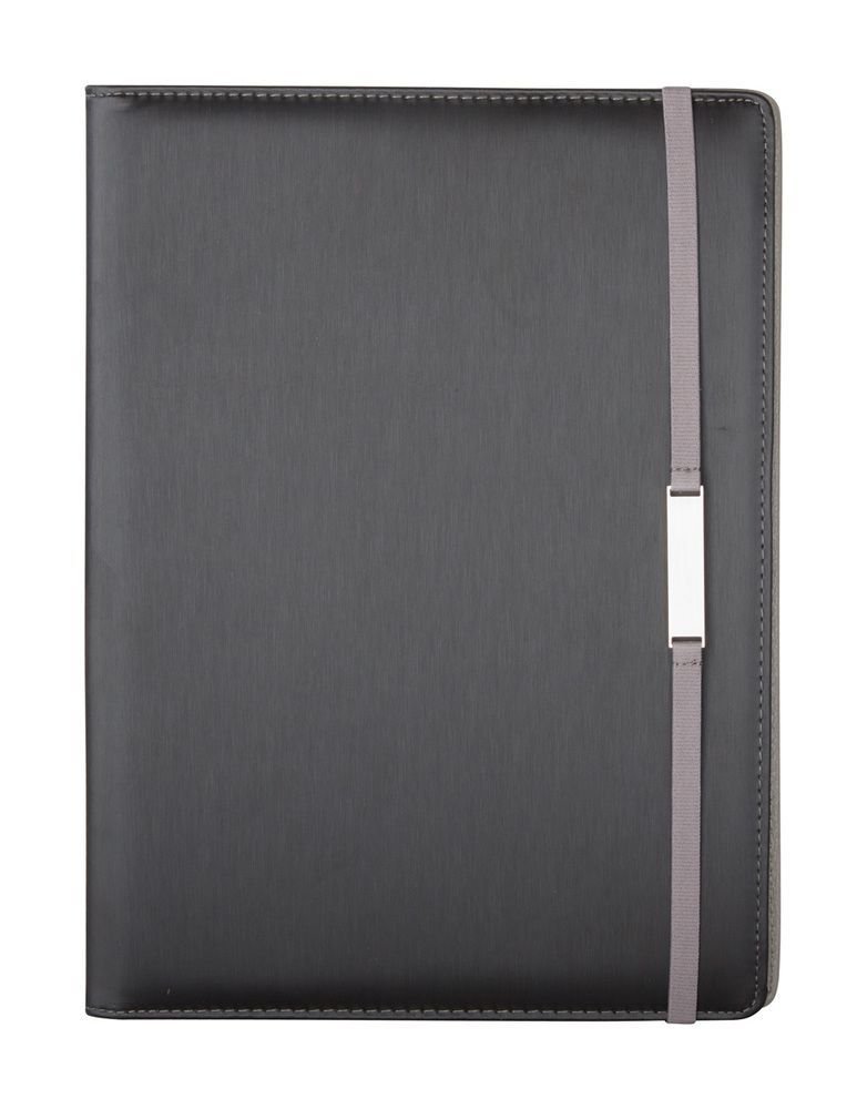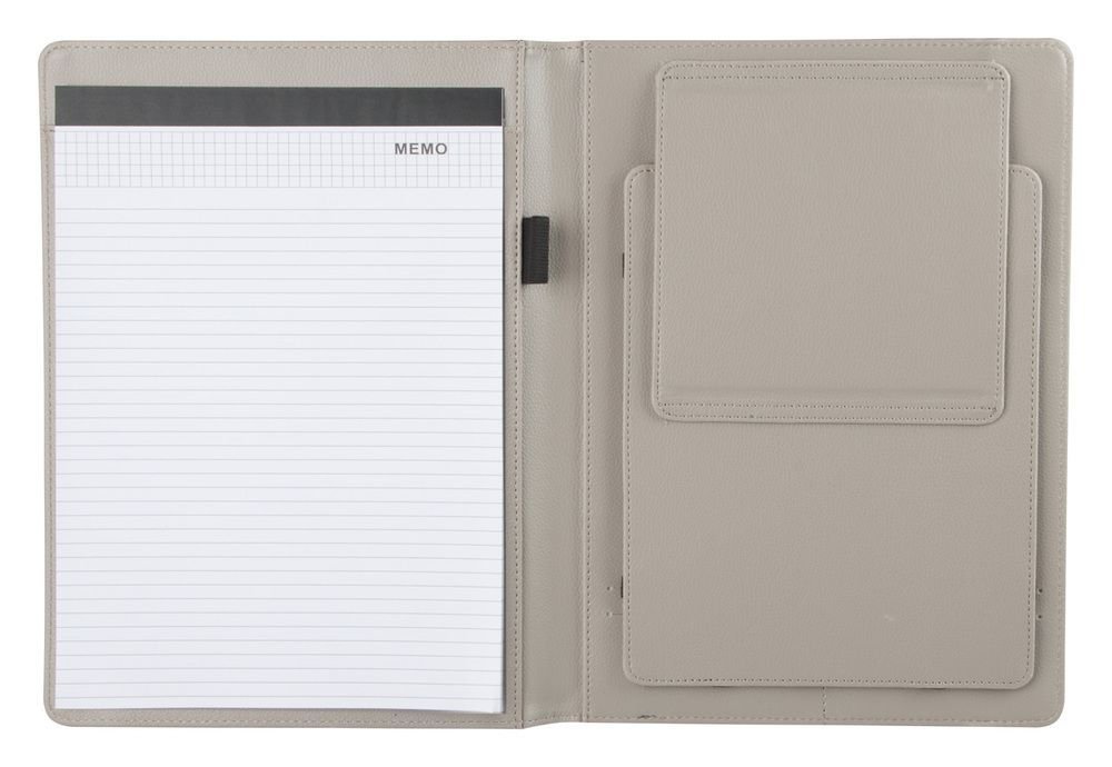 Kunstleder Mappe A4, mit iPad ® Tablett Halter sowie Notizblock (20 Seiten, liniert) und Schlaufe für ein Schreibgerät.
