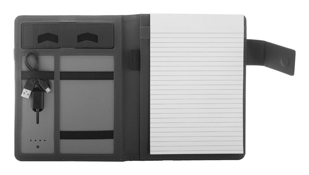 A4 Dokumentenmappe aus 300D Polyester mit 4000 mAh Powerbank, 16 GB USB-Stick, eingebautem, kabellosen Ladegerät, Tablett- und Stifthalter, mit Notizblock (20 Blatt). Inkl. USB-Ladekabel.