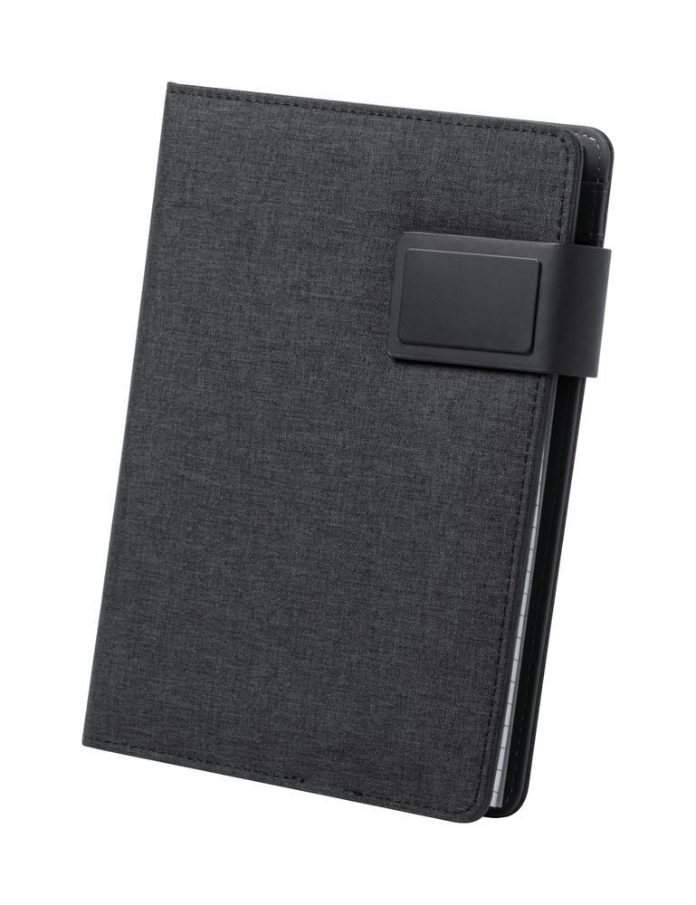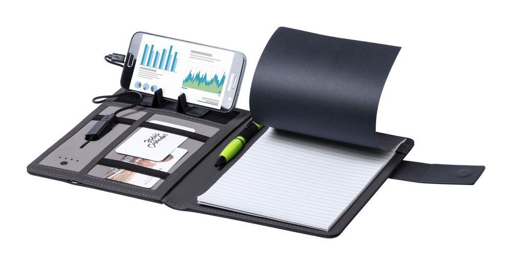 300D Polyester Dokumentenmappe mit 4000 mAh Powerbank, Visitenkarten-, Stifte- und Handyhalter und A5-Schreibblock mit 20 linierten Seiten. Mit Micro-USB-Ladekabel.