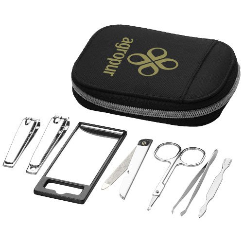 Sorgt dafür, dass Sie immer gut aussehen. Set mit Spiegel, Pinzette, Nagelknipser, Zehnagelknipser, Schere, Nagelfeile und Nagelhautschieber. Das Set wird in einem handlichen Nylonetui geliefert. Microfibre nylon.