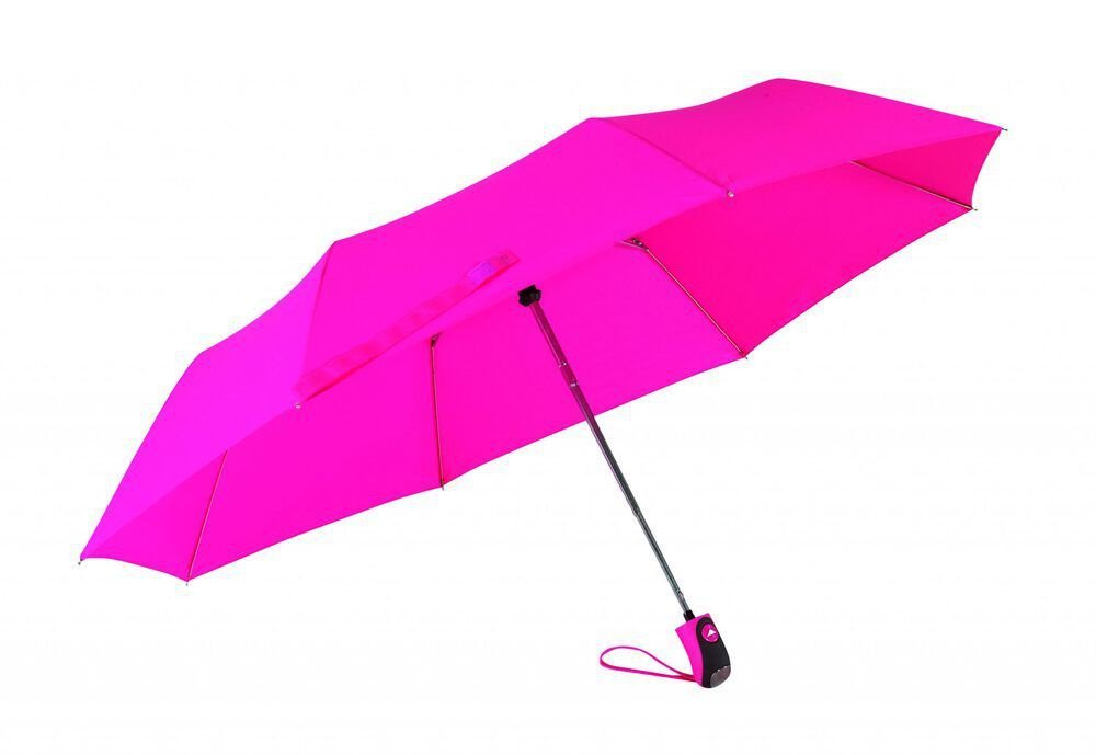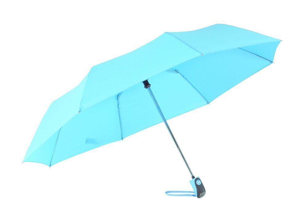 Automatik-Taschenschirm COVER: 3-teiliger Metallstock, Metallspeichen und -tips, gummierter Griff, Polyester-Pongee-Bespannung und -Hülle, Schließband mit Klettverschluss.