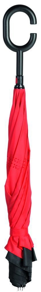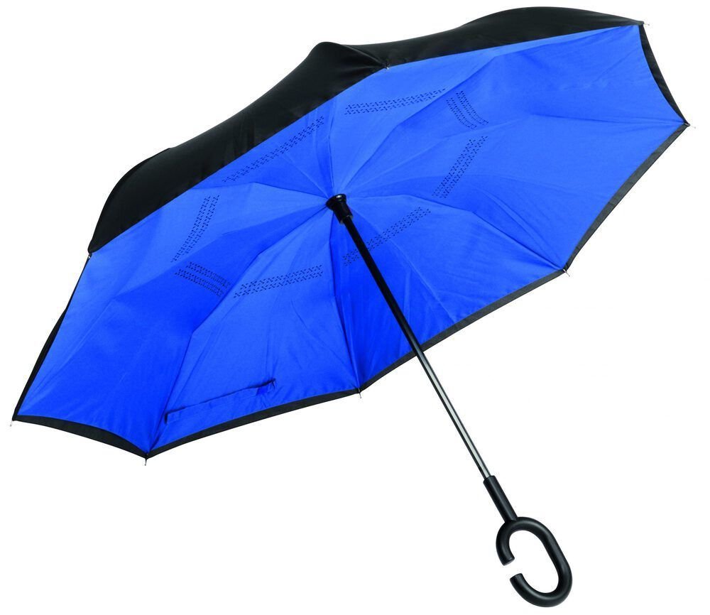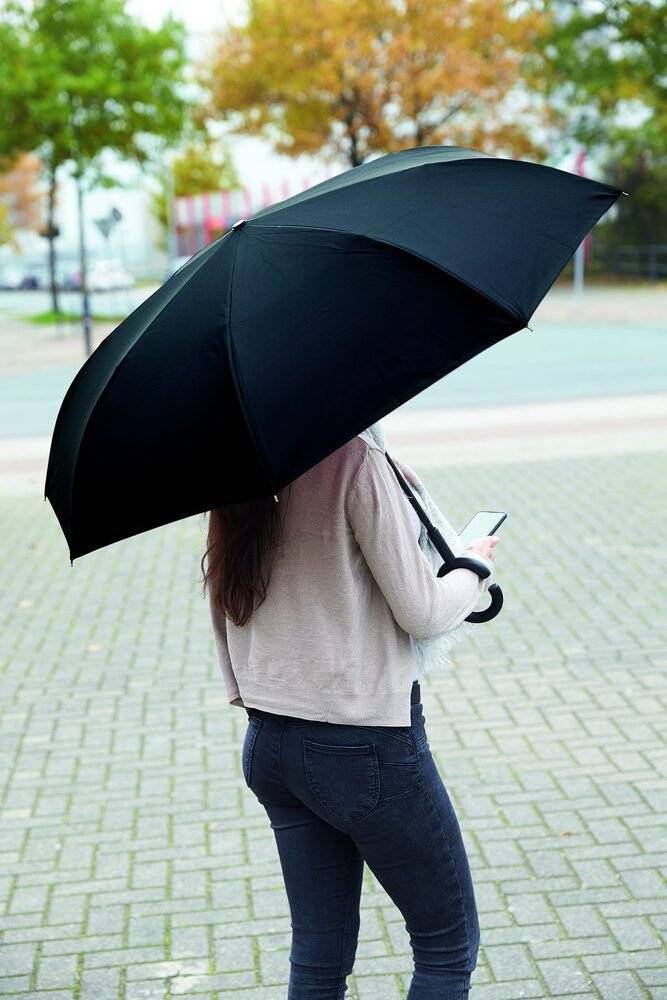 Stockschirm mit umgekehrtem Öffnungs- und Schließmechanismus, Sicherheitsschieber, freie Hände dank C-Shape-Griff, Doppel-Bezug mit Ventilationsmuster zur Vermeidung von Luftstau, flexibles Gestänge durch Fiberglasspeichen, Metallstock, mit Metalltips, Polyester-Pongee-Bespannung, Schließband mit Klettverschluss, Ø109 cm