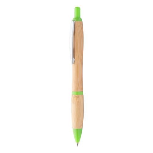 Bambus-Kugelschreiber mit farbigen Kunstoffelementen und Metallclip. Mit blau schreibender Mine.