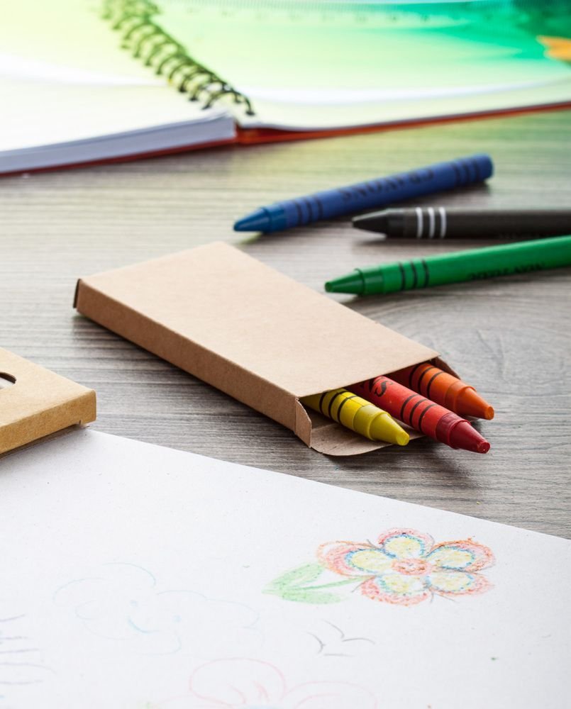 Schüttelpenal zum Ausmalen aus Non-Woven mit 5 Wachsmalstiften.