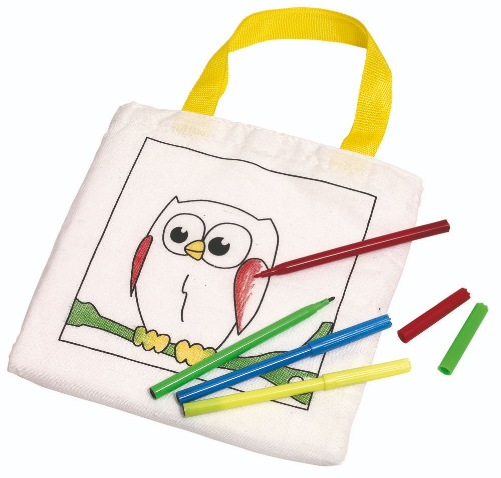 Kleine Baumwolltasche PAINT YOUR POCKET für Kinder: mit Motiv zum Ausmalen auf der Vorderseite, inkl. 4 Filzstifte in 4 verschiedenen Farben, kurze Henkel zum Tragen.