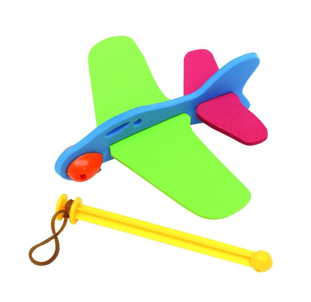 Flugzeug SKY HOPPER zum Zusammenbauen, 4-teilig: bestehend aus Kunststoff-Schleuder mit Gummiband, 3 Teile aus Moosgummi, verpackt im PVC-Beutel.