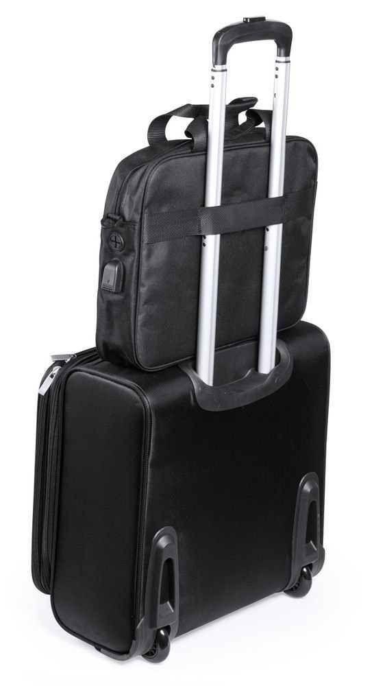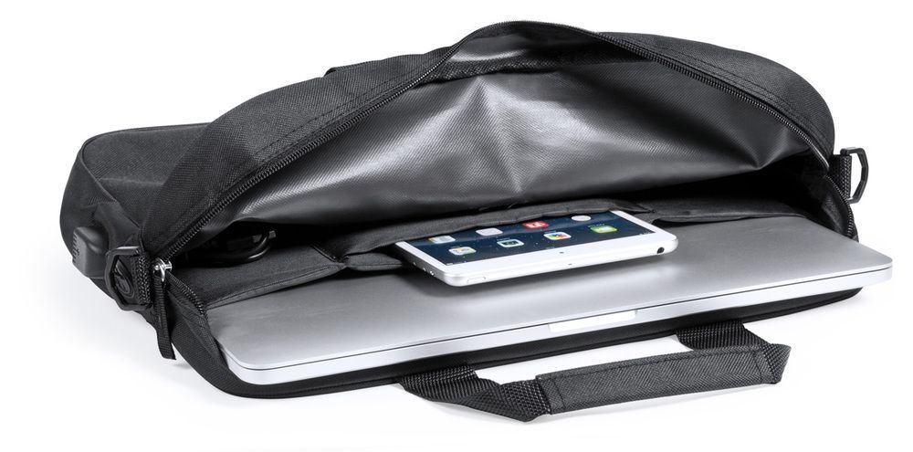 Dokumententasche mit gepolstertem Laptop und Tablett-Fach. Einstellbarem Schultergurt. Mit eingebautem USB-Verbindungsstück für Powerbanks und Kopfhörer-Kabelausgang. Material: 600D Polyester.