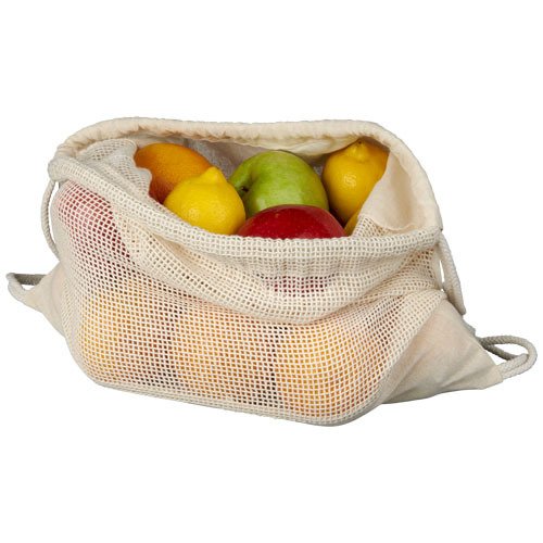 Wiederverwendbarer Rucksack aus Baumwollgewebe für Obst und Gemüse. Ausgestattet mit einem großen Hauptfach mit Kordelzugverschluss. Beständigkeit bis zu 5 kg. Baumwolle, 170 g/m2.