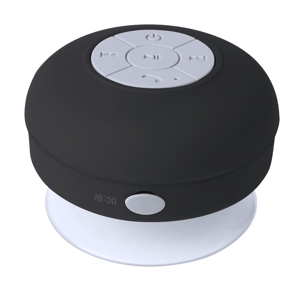 Bluetooth-Lautsprecher mit gummierter Oberfläche, großem Saugnapf, IPX4-Spritzwasserschutz, Freisprech-Funktion und aufladbarem Akku. Inkl. USB-Ladekabel.