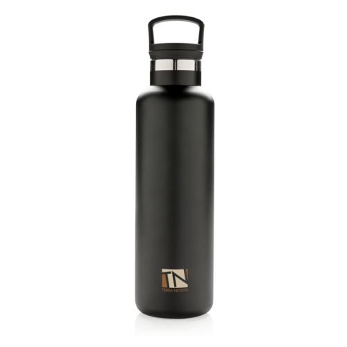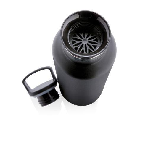 Pulverbeschichtete, doppelwandig isolierte Vakuumflasche mit schwarzem Griff. Der 2-in-1 Deckel mit Filter eignet sich perfekt für Tee oder als Aromafach. Die Flasche für alle Anlässe! 304 SS innen und 201 SS außen hält Ihre Getränke für bis zu 5h warm und 15h kalt.