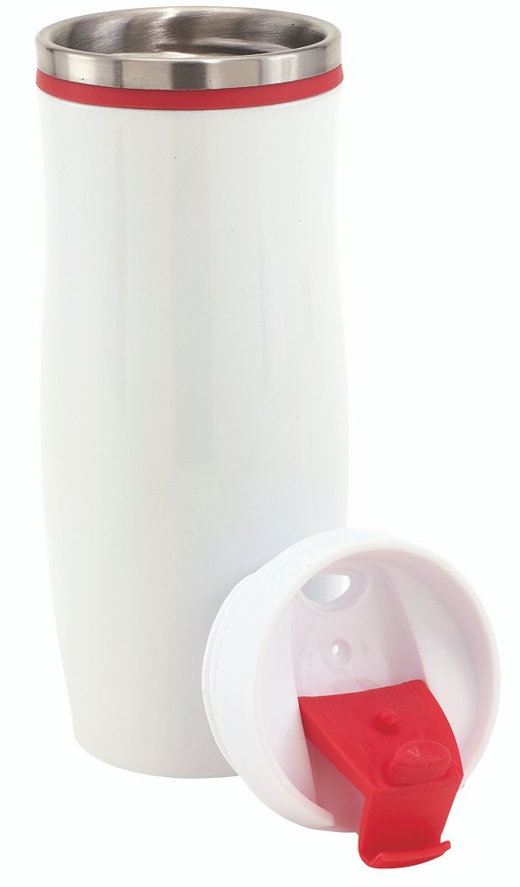 Isolierbecher CREMA, doppelwandig: innen und außen aus Edelstahl, Kunststoff-Deckel mit sicherem Schraubverschluss und integrierter Trinköffnung zum Aufklappen, farbig-gummierte Manschette oben sowie gummierter Standfuß für gute Bodenhaftung, Füllmenge ca. 400 ml