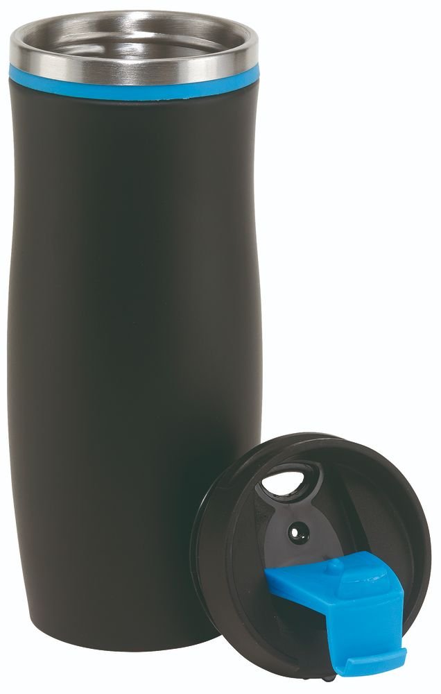 Isolierbecher DARK CREMA, doppelwandig: innen und außen aus Edelstahl, Kunststoff-Deckel mit sicherem Schraubverschluss und integrierter Trinköffnung zum Aufklappen, farbig-gummierte Manschette oben sowie gummierter Standfuß für gute Bodenhaftung, Füllmenge ca. 400 ml