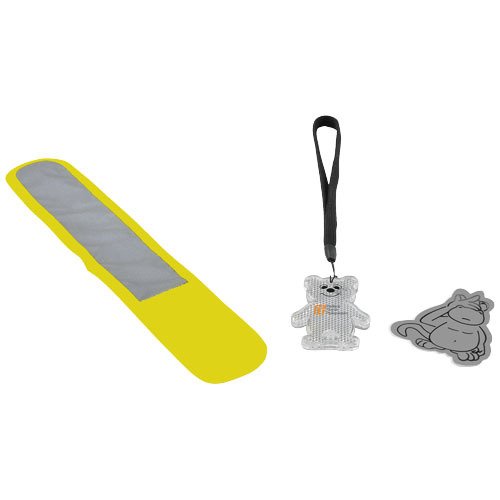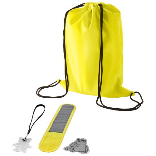 Mit EN1150 konformer Kinderwarnweste, Affen Aufkleber, reflektierendem Bären mit Band, Armband und Rucksack. Werbeanbringung nur auf dem Beutel und der Weste. Polyester.