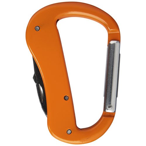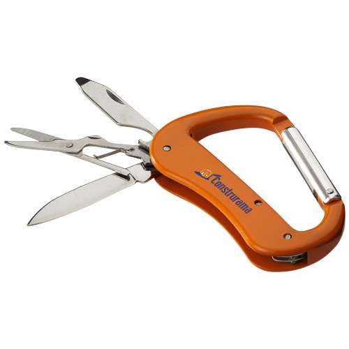 5 Funktionen Karabiner mit einem Taschenmesser, klappbarer Schere, Schlitzschraubendreher, Flaschenöffner und Feile. Aluminium.