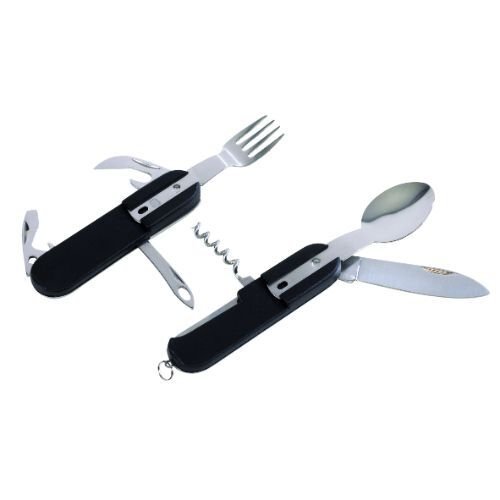 Edelstahl-Multifunktionswerkzeug WILDLIFE, 7-teilig: inkl. ausklappbarem Messer, Flaschen- und Dosenöffner, Entschupper und Korkerzieher, ausziehbarer Gabel und Löffel, mit Schlüsselring, in Tasche mit integrierter Gürtelschlaufe und Klettverschluss – ideal für Camping, Picknick und Outdooraktivitäten.