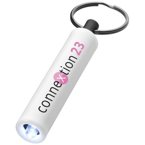 Ein weißes LED Licht, das mit einer Drucktaste ein- und ausgeschaltet wird. Geteilter Schlüsselring aus Metall. Inkl. Batterien. Kunststoff.
