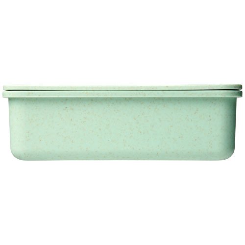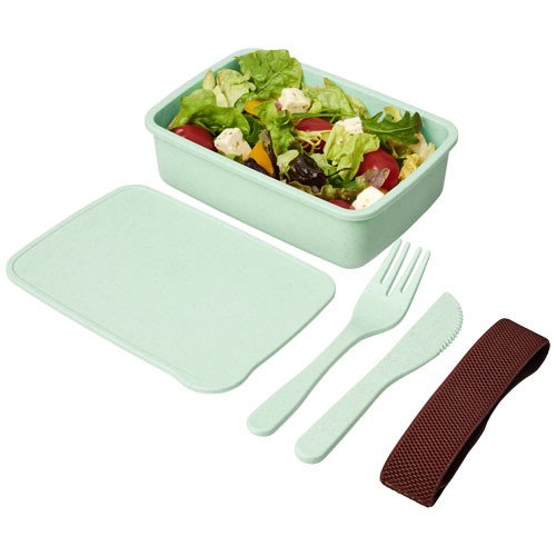 Brotdose aus 50 % Bambusfaser und 50 % PP-Kunststoff. Das Set enthält Gabel, Messer und ein Gummiband, um alle Teile zusammenzuhalten. Bamboo fibre, PP-Kunststoff.