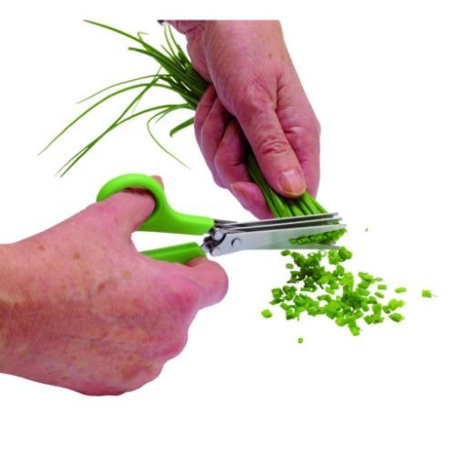 Kräuterschere RACY: mit 3 Klingen, grünem Kunststoffgriff und Reinigungspinsel, in Schutzhülle mit Klettverschluss.