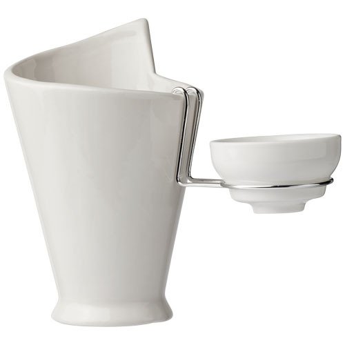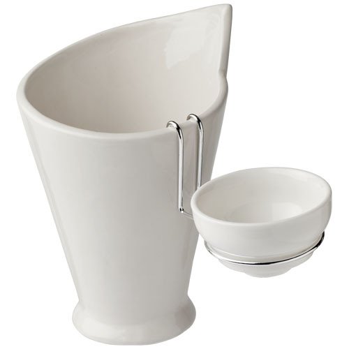 Kegelförmiges Pommes frites-Behälter-Servierset mit Dip-Schale aus weißer Keramik. Kann für eine Vielzahl von Snacks verwendet werden. Keramik, Rostfreier Stahl.