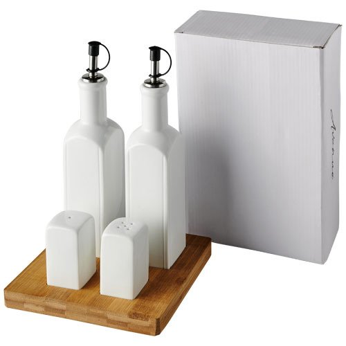 Salz- und Pfefferstreuer aus Keramik sowie Öl- und Essigspender mit Bambusholz-Unterteil. Befüllen Sie die Spender mit nicht mehr als 250 ml Öl oder Essig. Das Fassungsvermögen der Spender beträgt 250 ml. 20% Keramik, 20% Bambusholz, 20% PP-Kunststoff, 20% Rostfreier Stahl, 20% Silikon-Kunststoff.