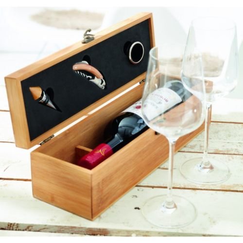 Weinset BAMBOO PRECIOUS für 1 Flasche: bestehend aus Tropfring aus Edelstahl, Metall-Flaschenverschluss mit Holzknauf und Edelstahl-Kellnermesser mit Holzgriff, in Box aus Bambus.
