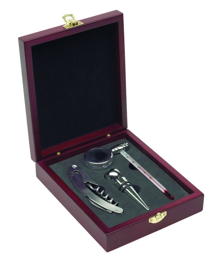 Weinset SALUTE in Holzbox: mit Weinthermometer aus Glas, Edelstahl-Tropfring, Metall-Flaschenverschluss und Edelstahl-Kellnermesser.